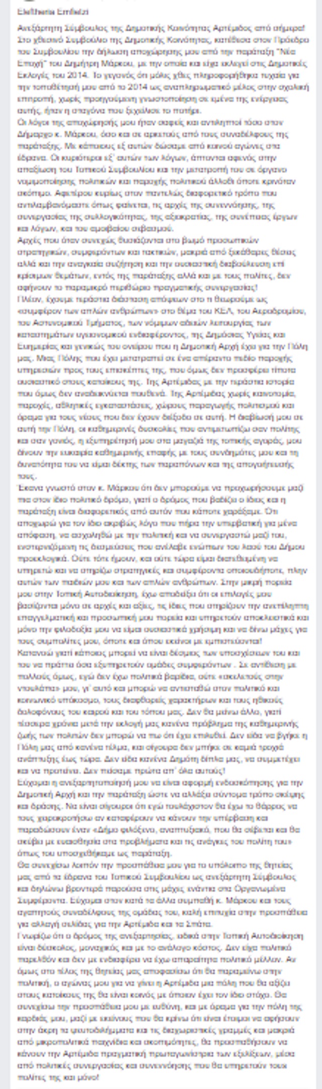 Διαβάστε εδώ τη δήλωση ανεξαρτητοποίησης της τοπικής συμβούλου Αρτέμιδας, Ελευθερίας Εμφιετζή.