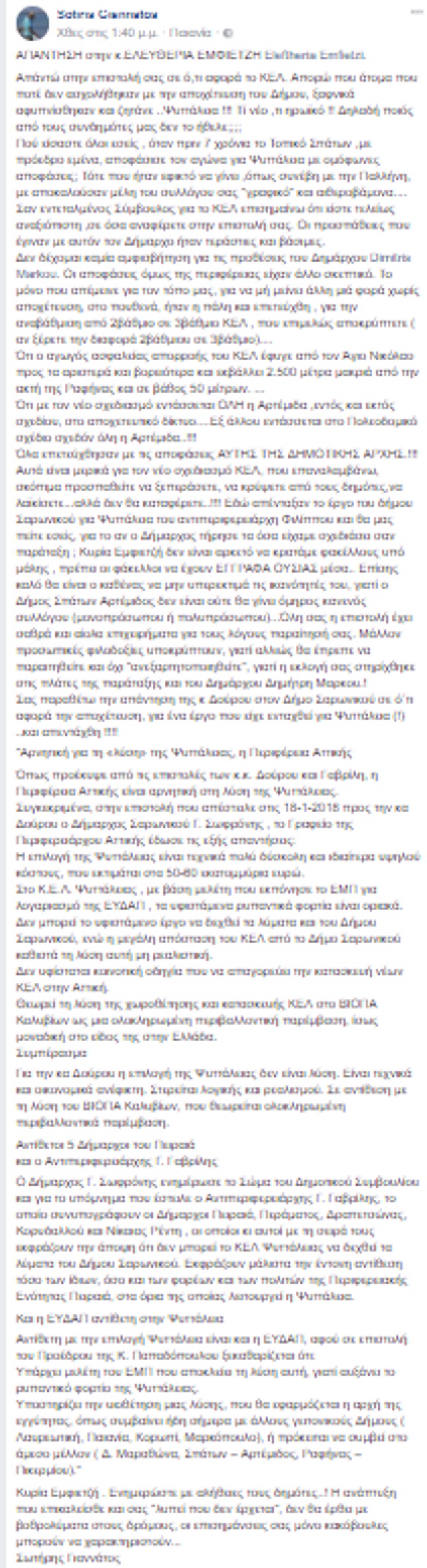 Συγκεκριμένα αυτό του Σαρωνικού το οποίο εξέδωσε ο εκεί δήμαρχος Γιώργος Σωφρόνης για να ενημερώσει τους πολίτες για τις αντιρρήσεις τόσο της Περιφέρειας όσο και της ΕΥΔΑΠ – σε συνδυασμό με τις αντιδράσεις του αντιπεριφερειάρχη και δημάρχων του Πειραιά - για το ενδεχόμενο μεταφοράς των λυμάτων των περιοχών του δήμου στο ΚΕΛ Ψυττάλειας.