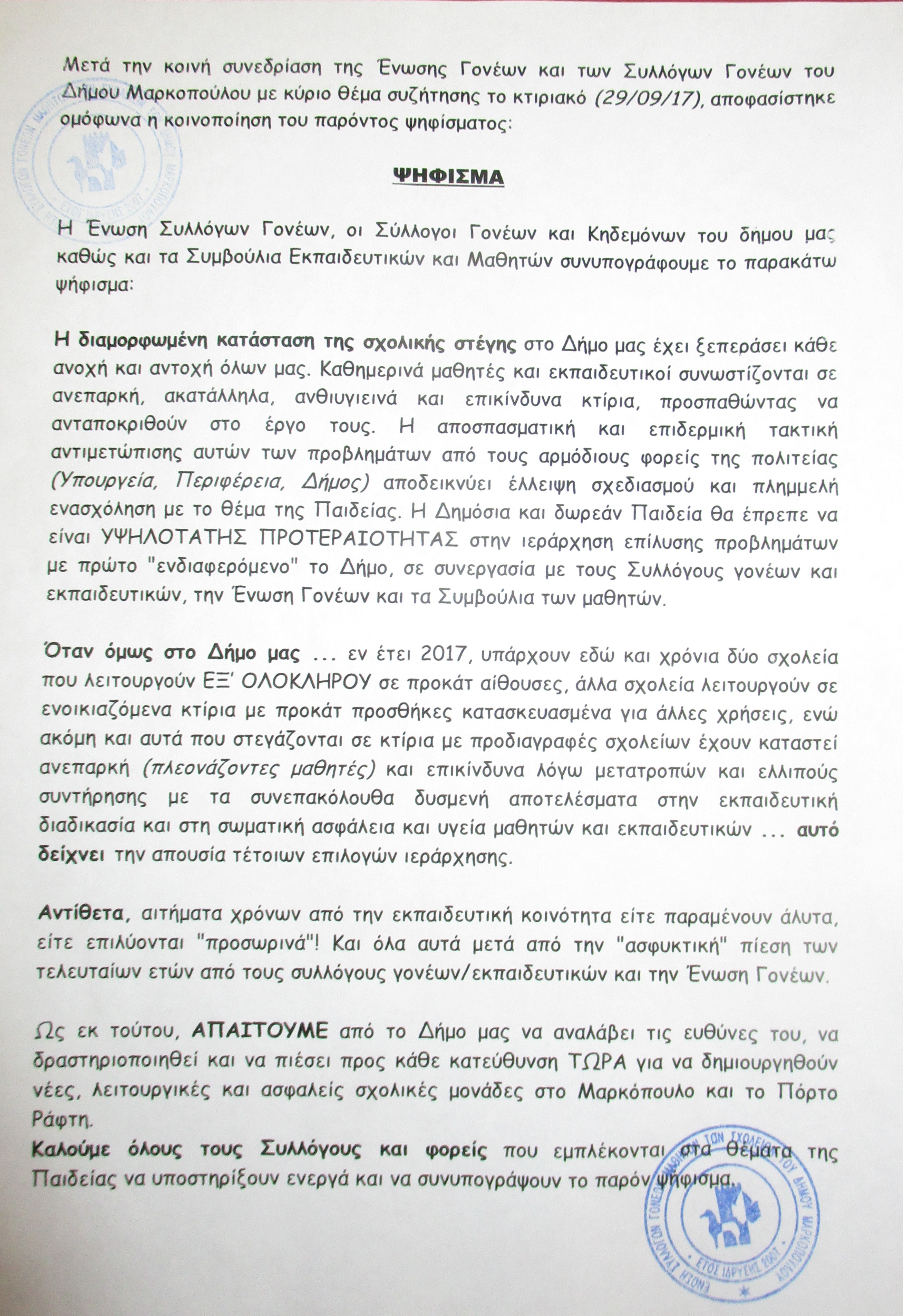 Στη διάρκεια της συγκέντρωσης μπροστά στο δημαρχείο, ο πρόεδρος της Ένωσης Συλλόγων Γονέων Δήμου Μαρκοπούλου, Νίκος Κασίμης, ανέγνωσε το ψήφισμα διαμαρτυρίας που είχε συνταχθεί ενώ χαιρετισμούς απηύθυναν ο πρόεδρος του Συλλόγου Εκπαιδευτικών Π.Ε. Ανατ. Αττικής “Κ. Σωτηρίου”, Κώστας Τουλγαρίδης, η εκπρόσωπος των παρεμβάσεων στο ΔΣ της ΟΛΜΕ, Άννα Μπαχτή και ο εκπρόσωπος της Λαϊκής Συσπείρωσης Μαρκοπούλου, Ανδρέας Συλλελόγλου.