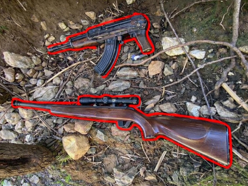 Σύμφωνα με πληροφορίες, στα ευρήματα περιλαμβάνονται ένα τυφέκιο τύπου Καλάσνικοφ (AK), ένα κυνηγετικό τυφέκιο bolt-action με διόπτρα, καθώς και κουτί με σφαίρες.