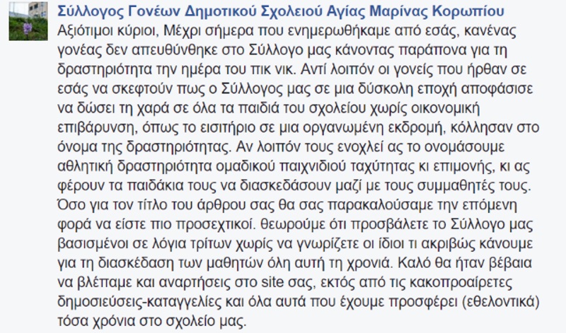Σε ανάρτησή του στο προφίλ του notioanatolika.gr στο facebook, ο χρήστης “Σύλλογος Γονέων Δημοτικού Σχολειού Αγίας Μαρίνας Κορωπίου”, υποστηρίζει ότι μέχρι τη δημοσιοποίηση του θέματος από το ειδησεογραφικό πόρταλ μας, “κανένας γονέας δεν απευθύνθηκε στο Σύλλογο μας κάνοντας παράπονα για τη δραστηριότητα την ημέρα του πικ νικ”.