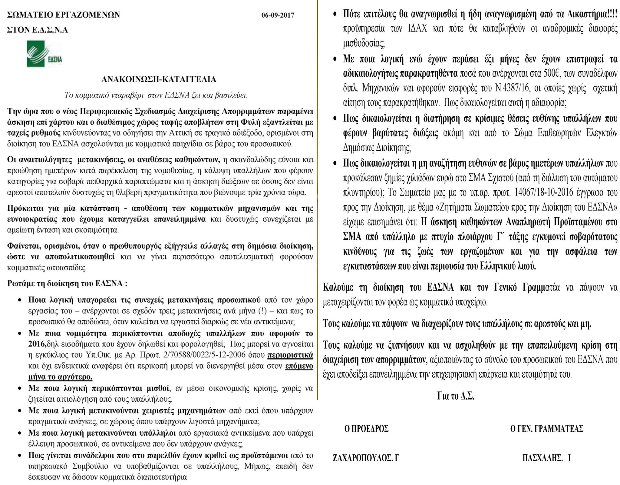 Πάντως προς... επίρρωσιν των όσων επεσήμανε ο δήμαρχος Μαρκοπούλου Σωτήρης Μεθενίτης, και για τον τρόπο που... δεν λειτουργεί η διοίκηση Δούρου στο θέμα των απορριμμάτων, ήρθε και η ανακοίνωση - καταγγελία του Σωματείου των εργαζομένων στον ΕΔΣΝΑ στην οποία γίνεται λόγος για κομματικά παιχνίδια σε βάρος του προσωπικού από ορισμένους στη διοίκηση του Συνδέσμου (σ.σ.: πρόεδρος του δ.σ. του ΕΔΣΝΑ είναι η κα Δούρου), «την ώρα που ο νέος Περιφερειακός Σχεδιασμός Διαχείρισης Απορριμμάτων παραμένει άσκηση επί χάρτου και ο διαθέσιμος χώρος ταφής αποβλήτων της Φυλής εξαντλείται με ταχείς ρυθμούς, κινδυνεύοντας να οδηγήσει την Αττική σε τραγικό αδιέξοδο».